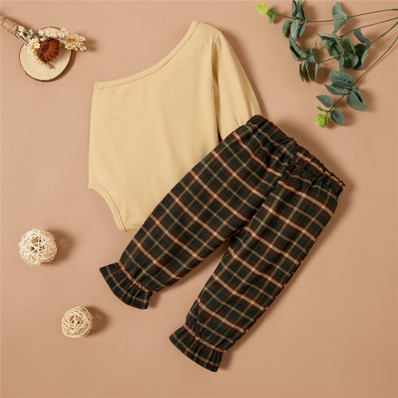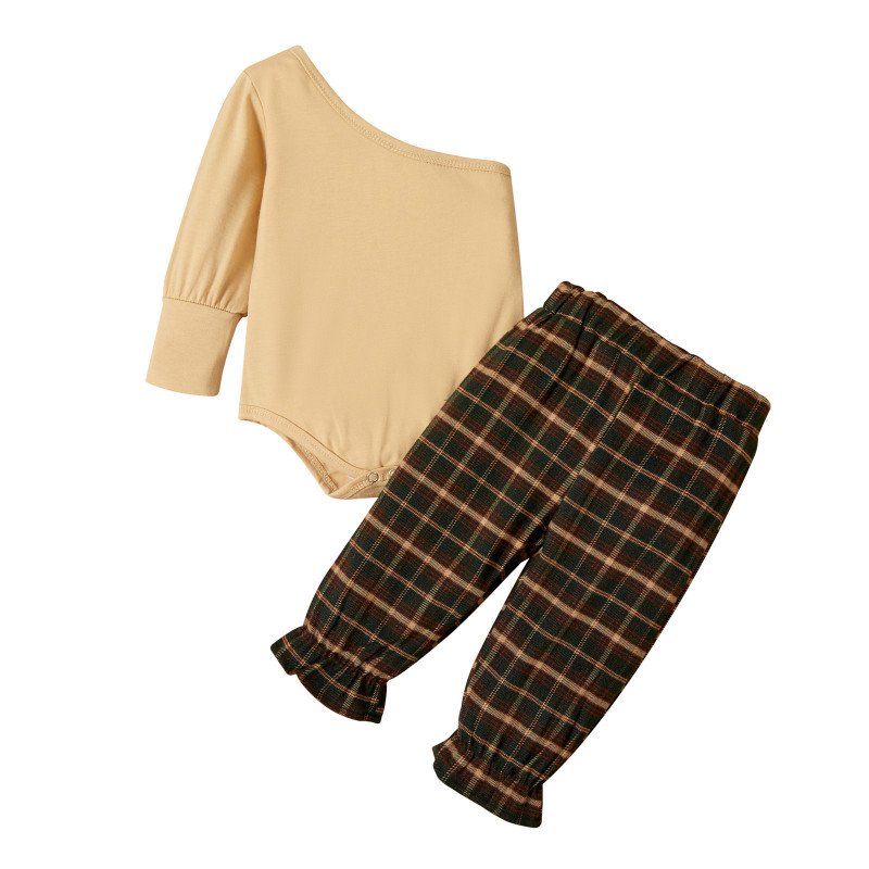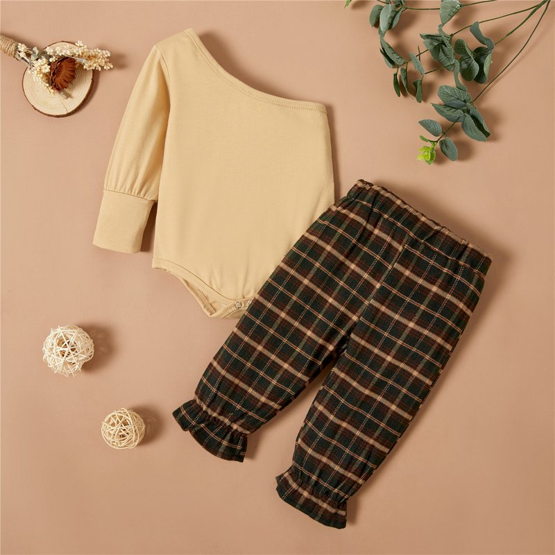 Toddler Newborn Baby Infant Girls One Shoulder Top And Plaid Print Pants 2pcs Set