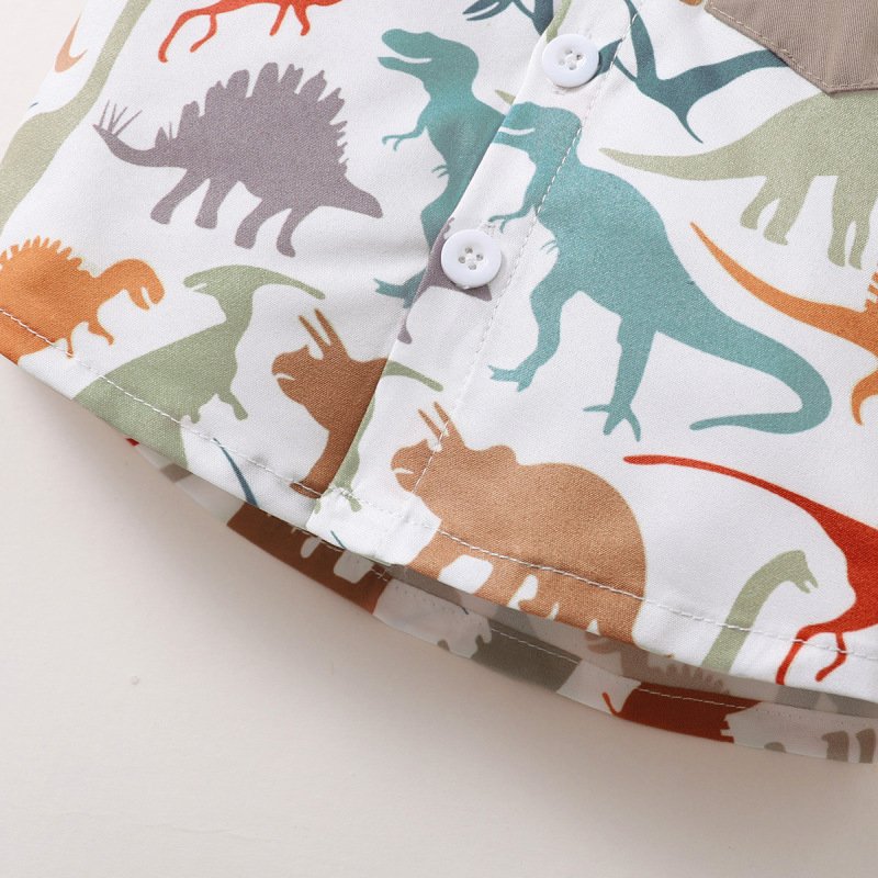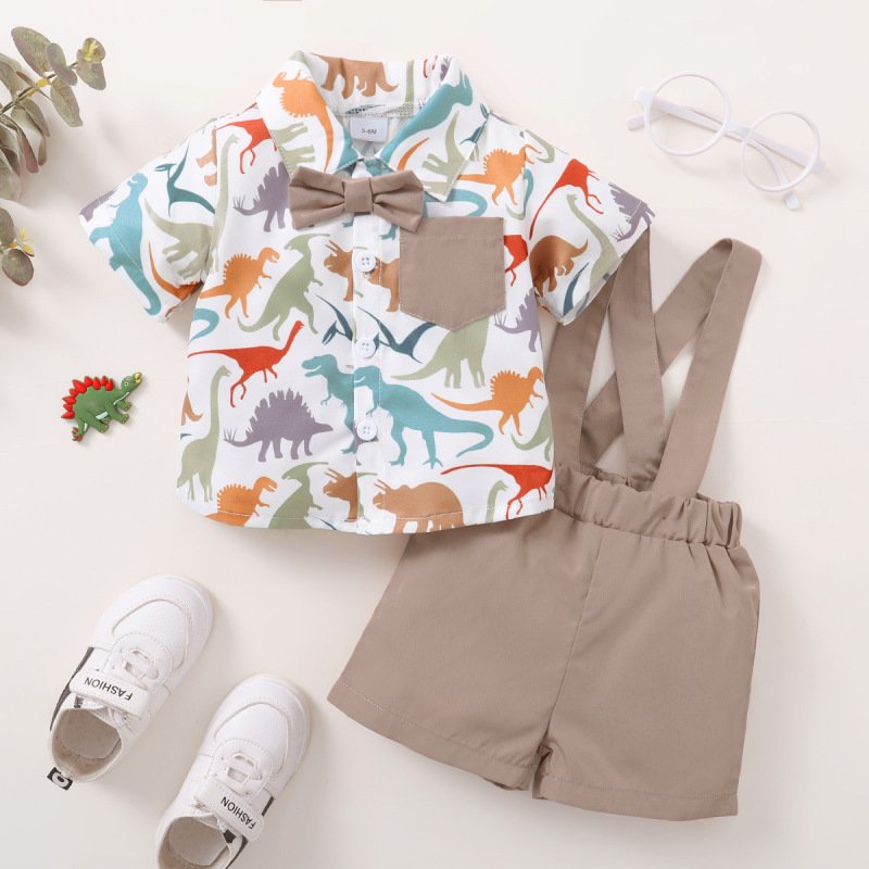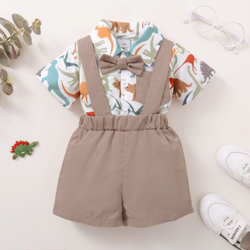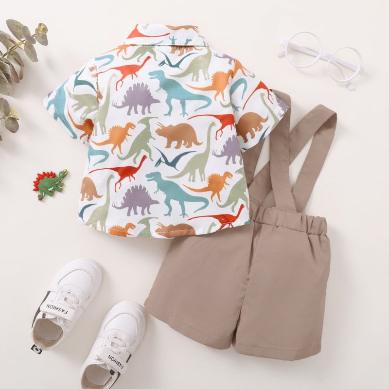 Toddlers Newborn Baby Fashion Boys Dinosaur Print Short Sleeve Top And Solid Color Suspenders Shorts 2pcs Set