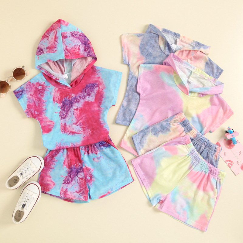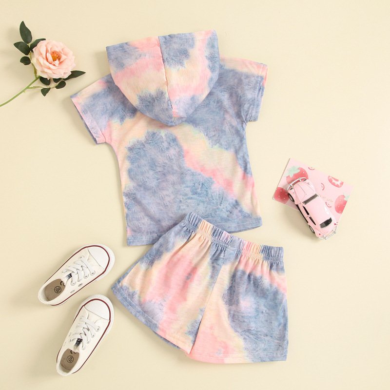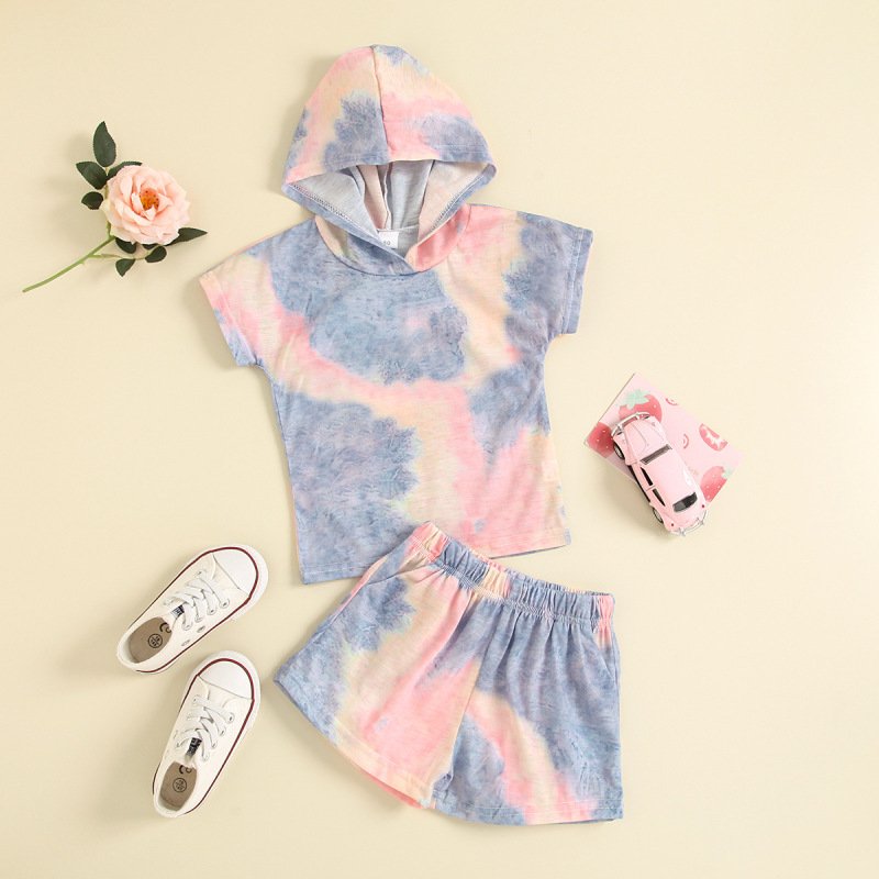 Toddlers Newborn Baby Fashion Girls Boys Short-Sleeved Tie-Dye Hooded Top And Shorts 2pcs Set