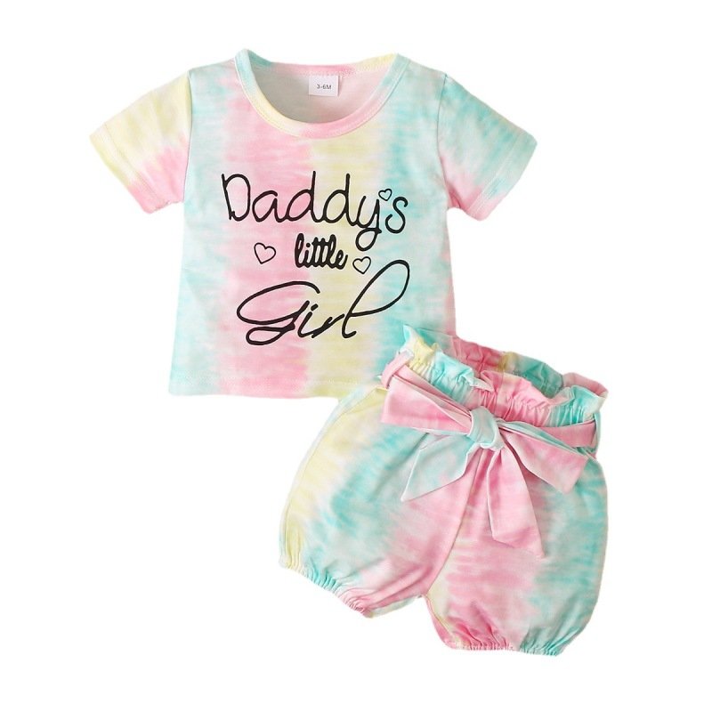 Toddlers Newborn Baby Fashion Girls Letter Print Short-Sleeved Top And Tie-Dye Shorts 2pcs Set