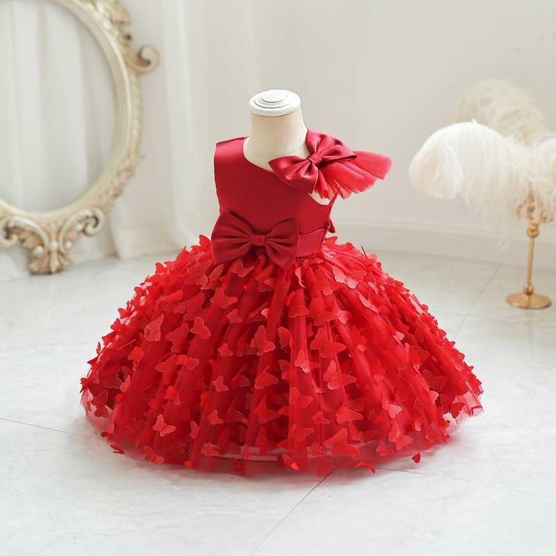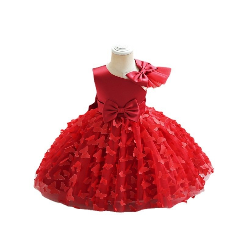 Toddlers Newborn Baby Fashion Girls Princess Ruffle Sleeve Solid Color Bowknot Butterfly Mesh Tutu Party Dress