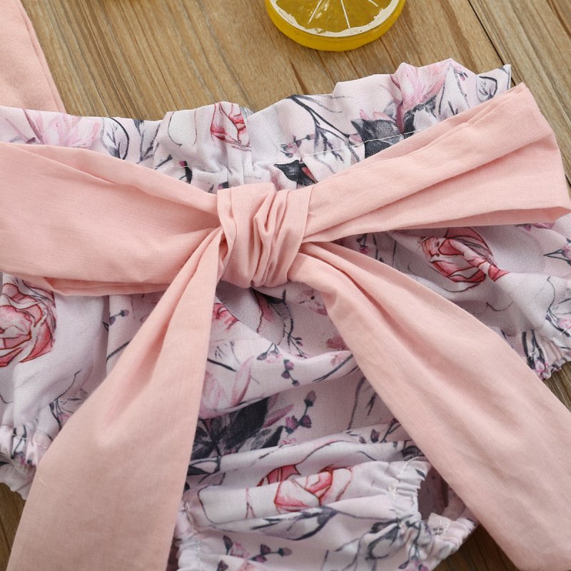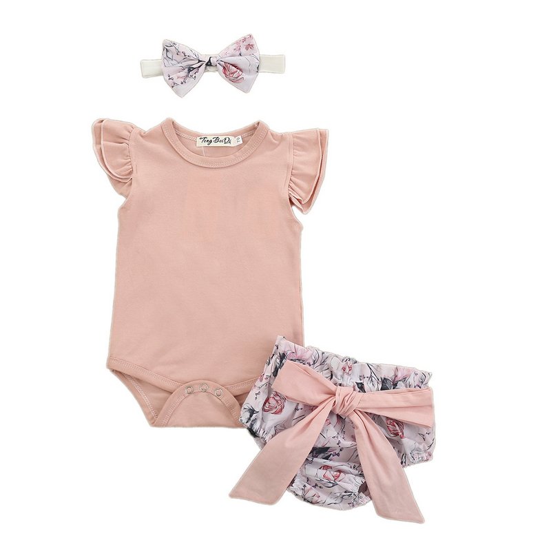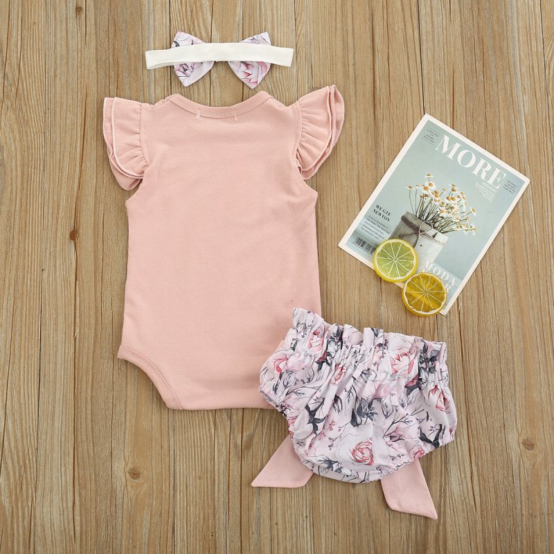 Toddlers Newborn Baby Fashion Girls Ruffle Sleeve Solid Color Bodysuit And Floral Print Short Set