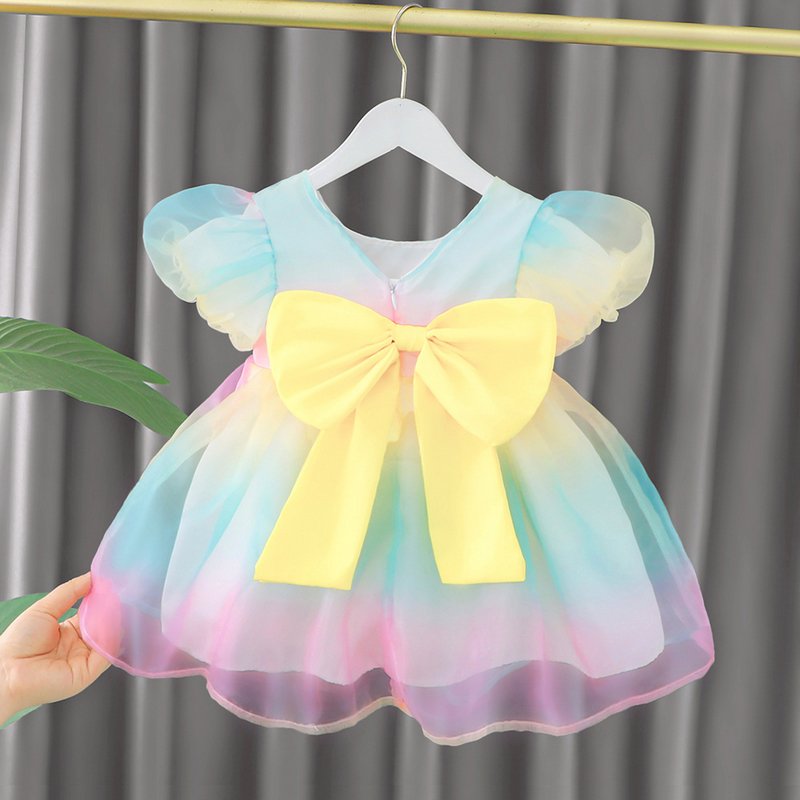Toddlers Newborn Baby Fashion Girls Short Sleeve Bow Rainbow Color Princess Dress