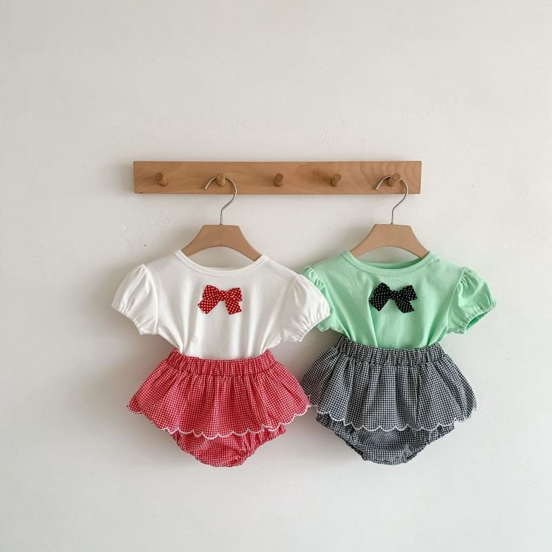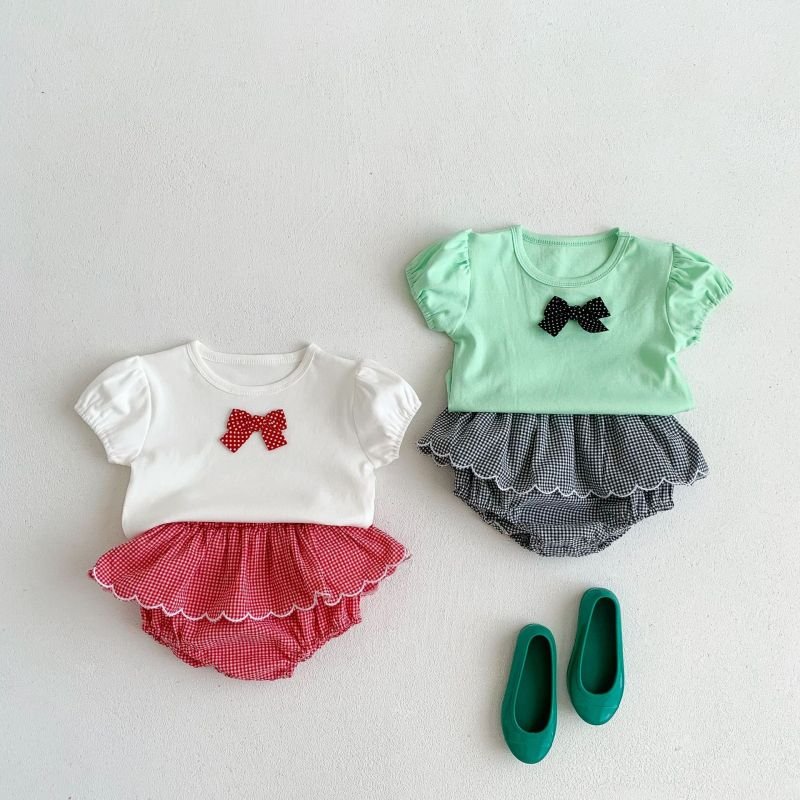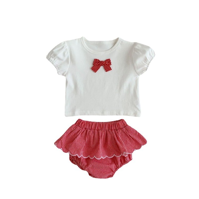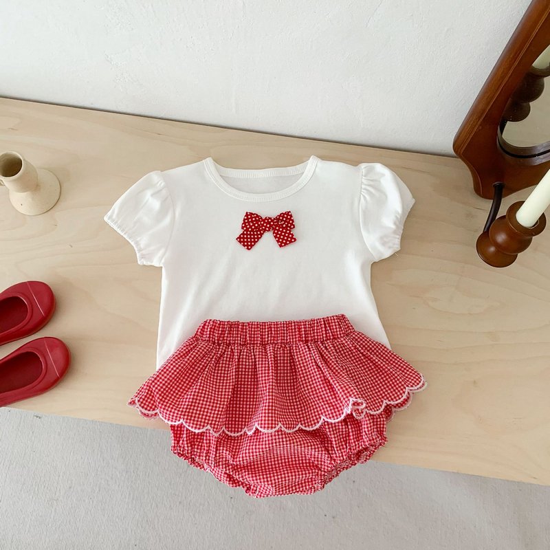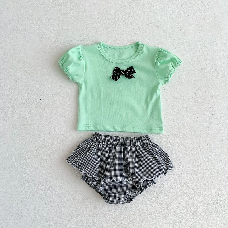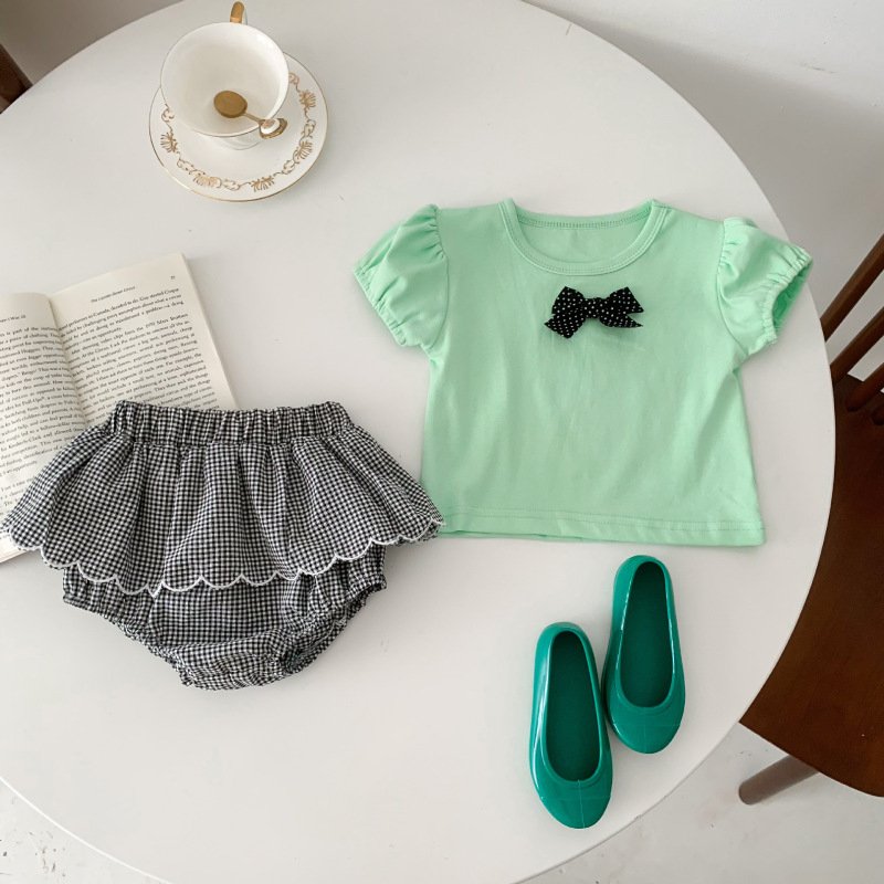 Toddlers Newborn Baby Fashion Girls Short Sleeve Bowknot T-Shirt And Plaid Print Shorts 2pcs Set