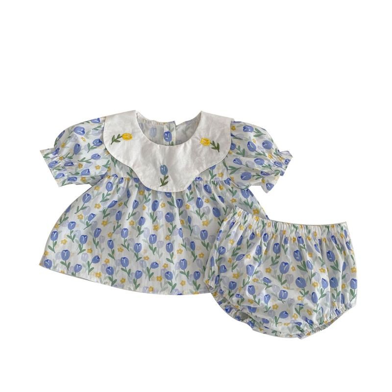 Toddlers Newborn Baby Fashion Girls Short Sleeve Peter Pan Collar Flower Print Top And Shorts 2pcs Set
