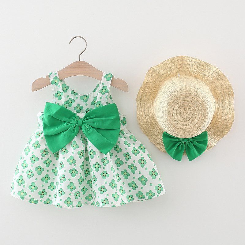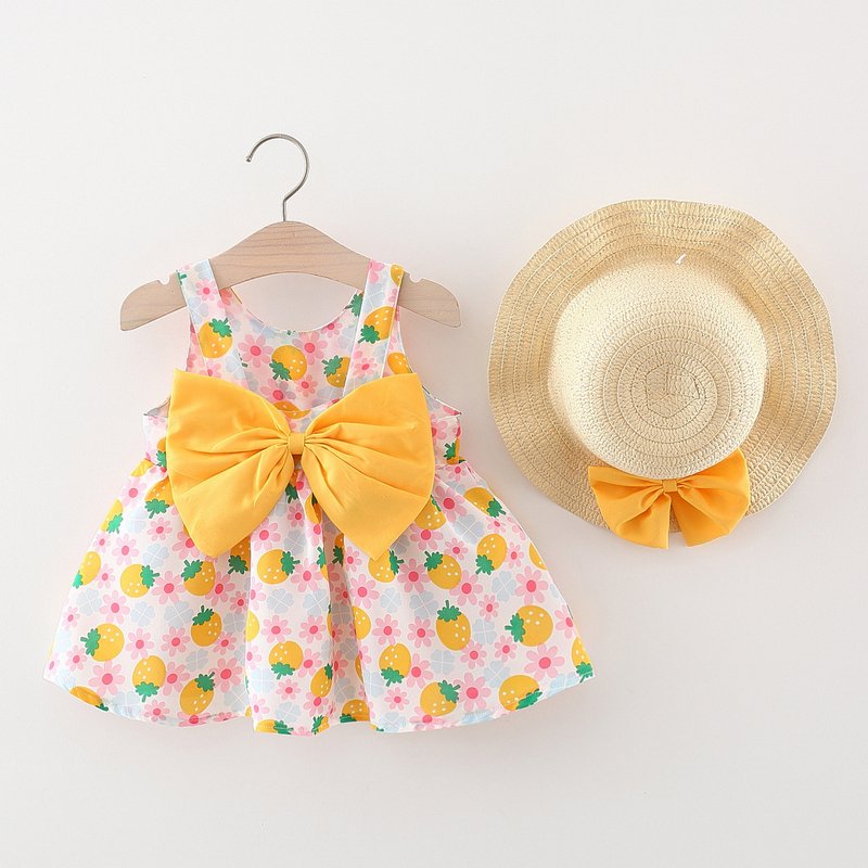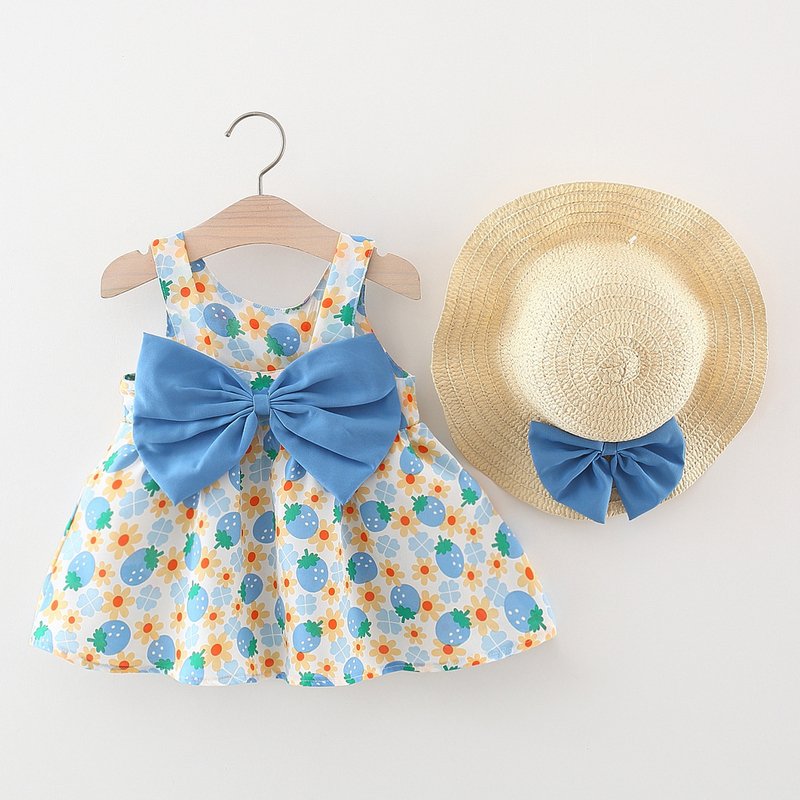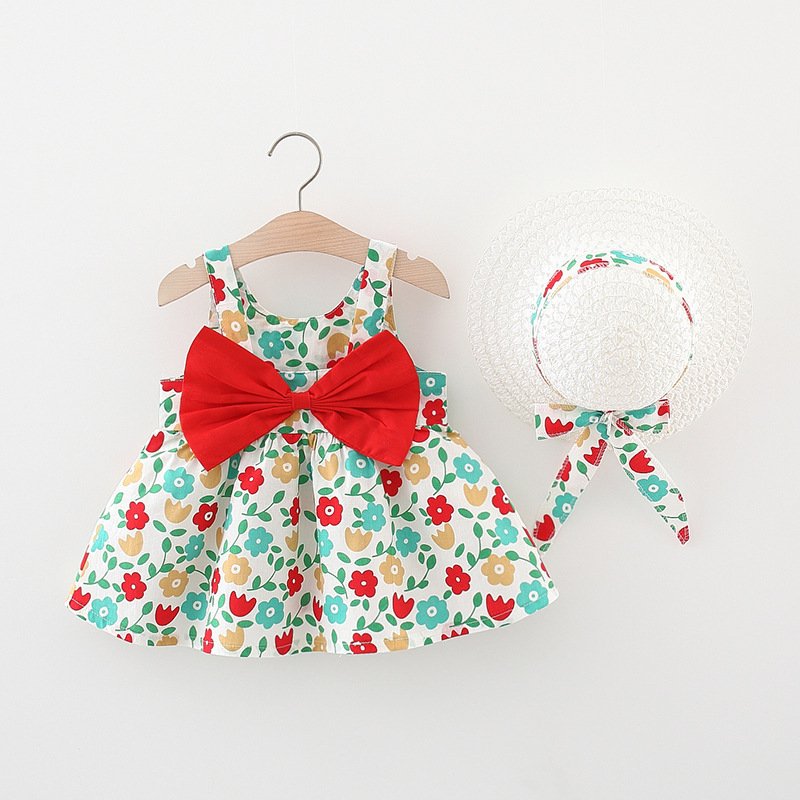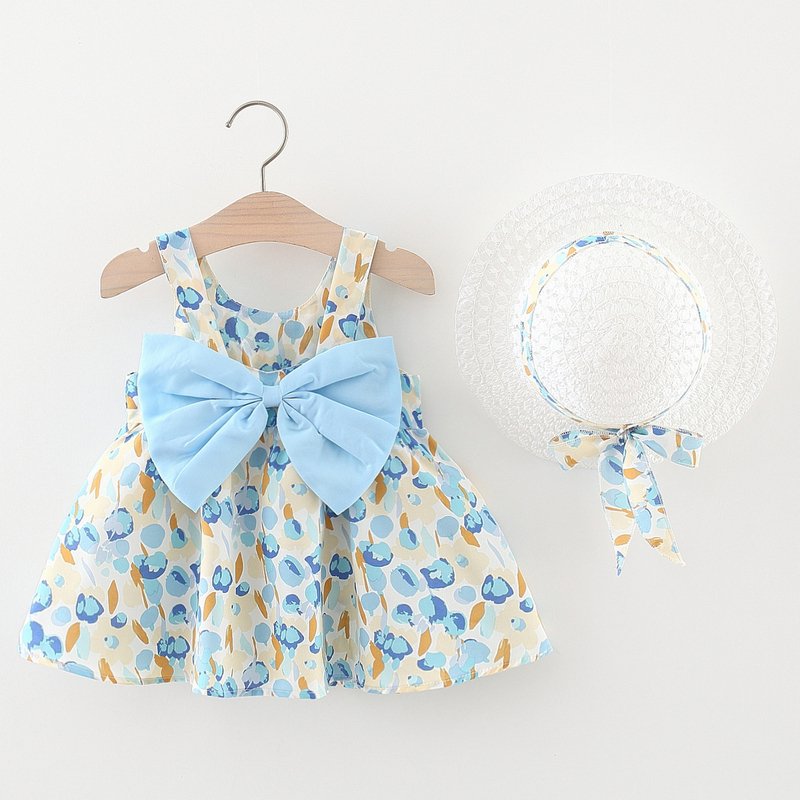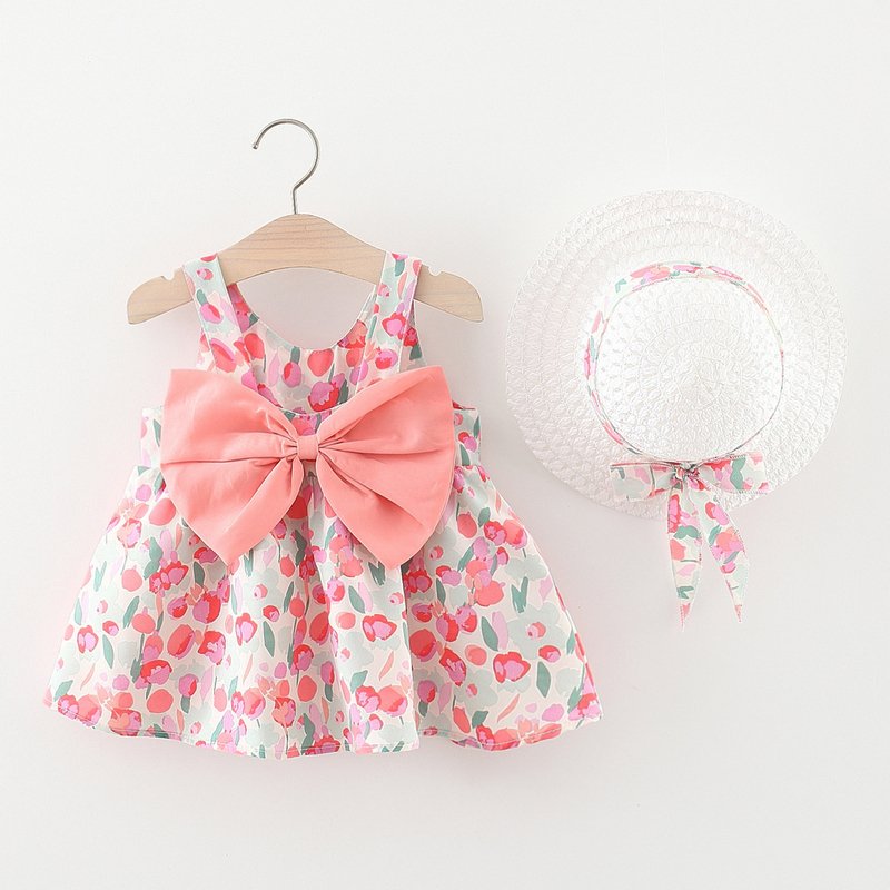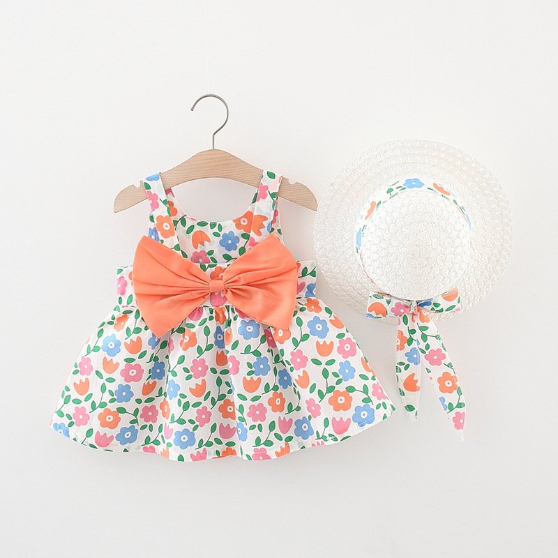 Toddlers Newborn Baby Fashion Girls Sleeveless Flower Print Bowknot Cute Dress And Straw Hat