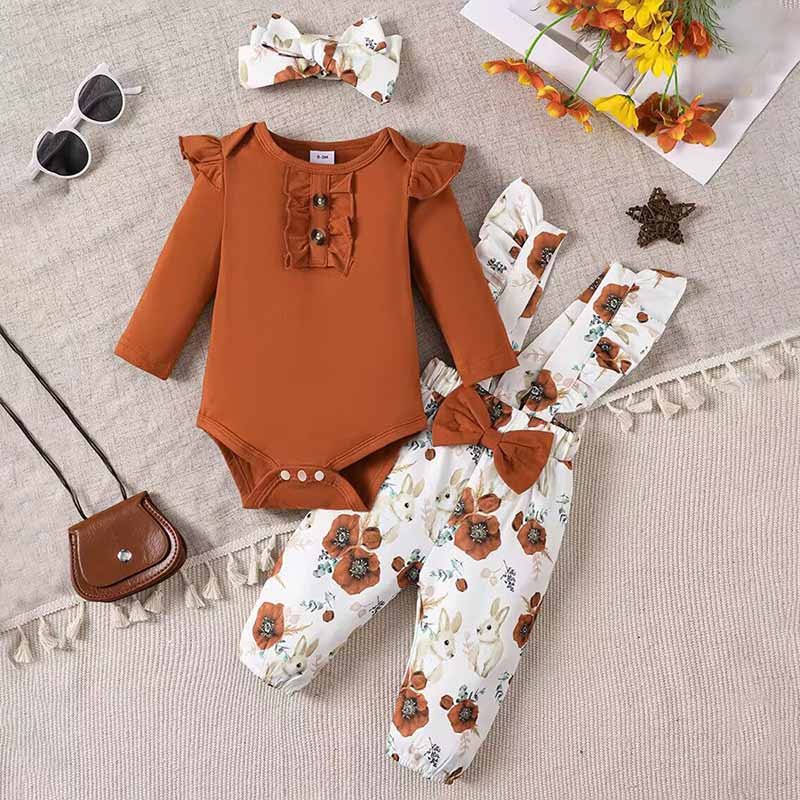 Toddlers Newborn Baby Fashion Girls Solid Color Long Sleeve Bodysuit And Floral Bunny Print Suspenders Headband 3pcs Set