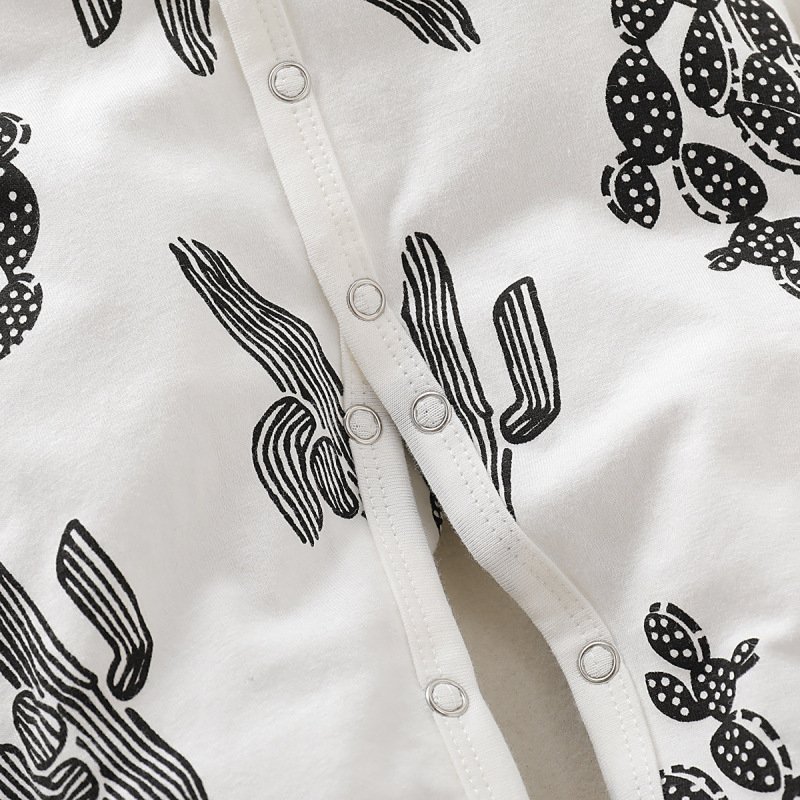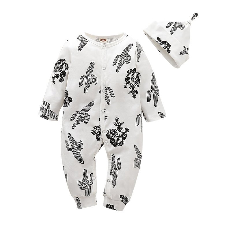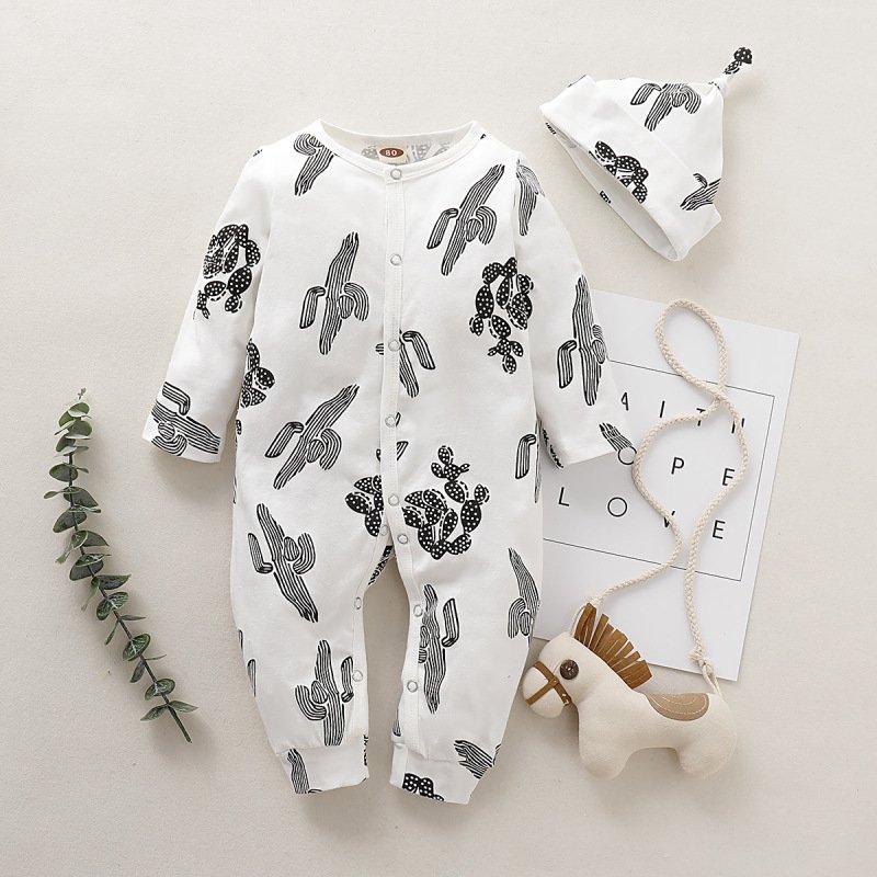 Toddlers Newborn Baby Girls Boys Long-Sleeved Cactus Printed Jumpsuit And Hat 2pcs Set