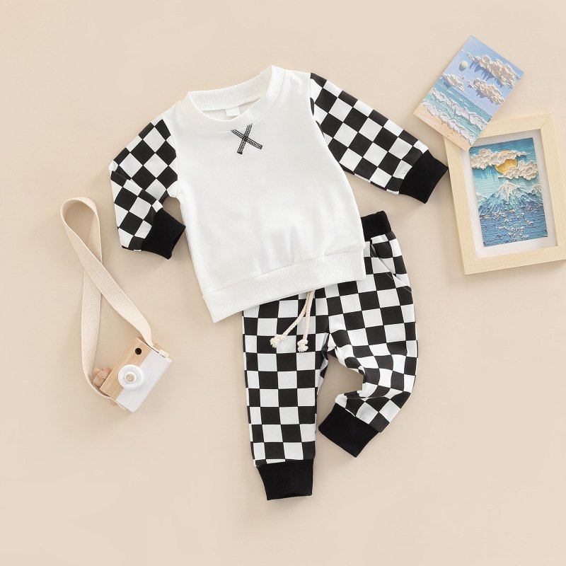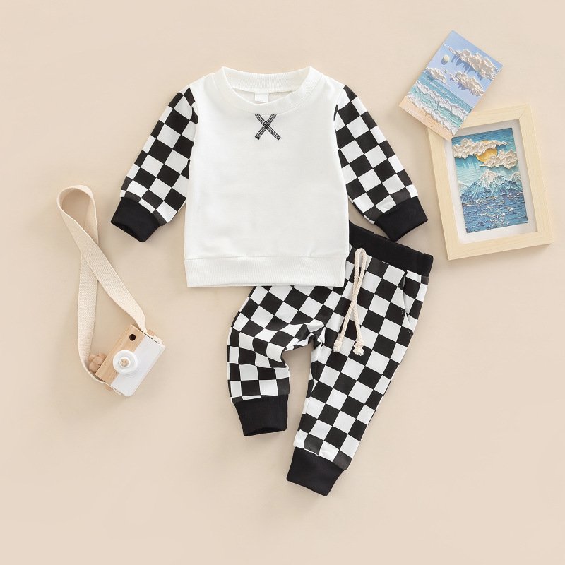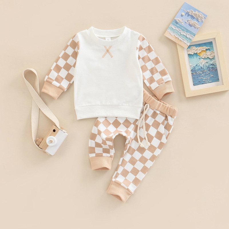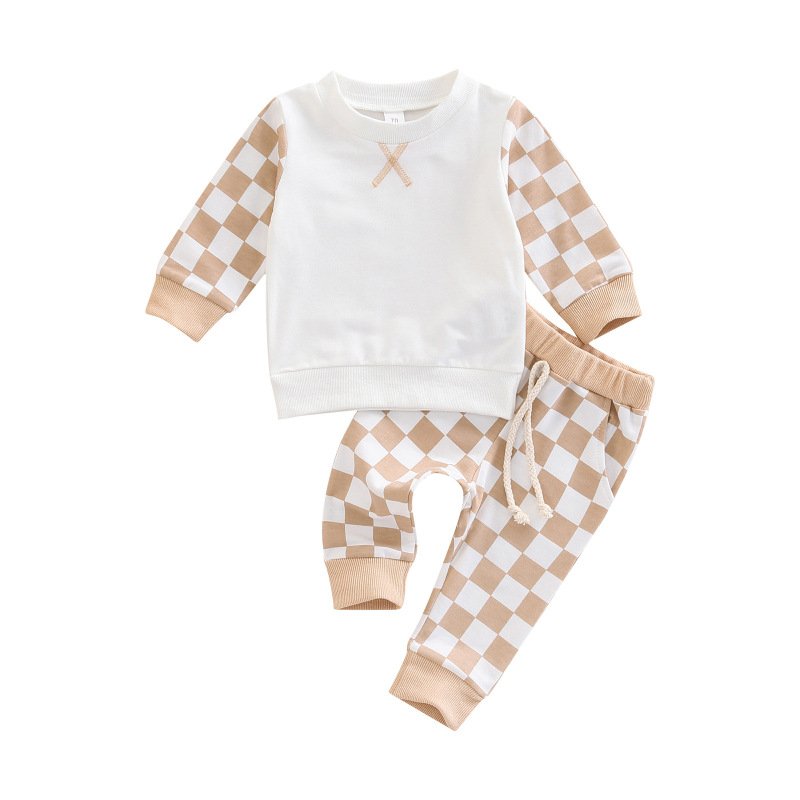 Toddlers Newborn Baby Girls Boys Long-Sleeved Checkerboard Printing Tops And Pants 2pcs Set