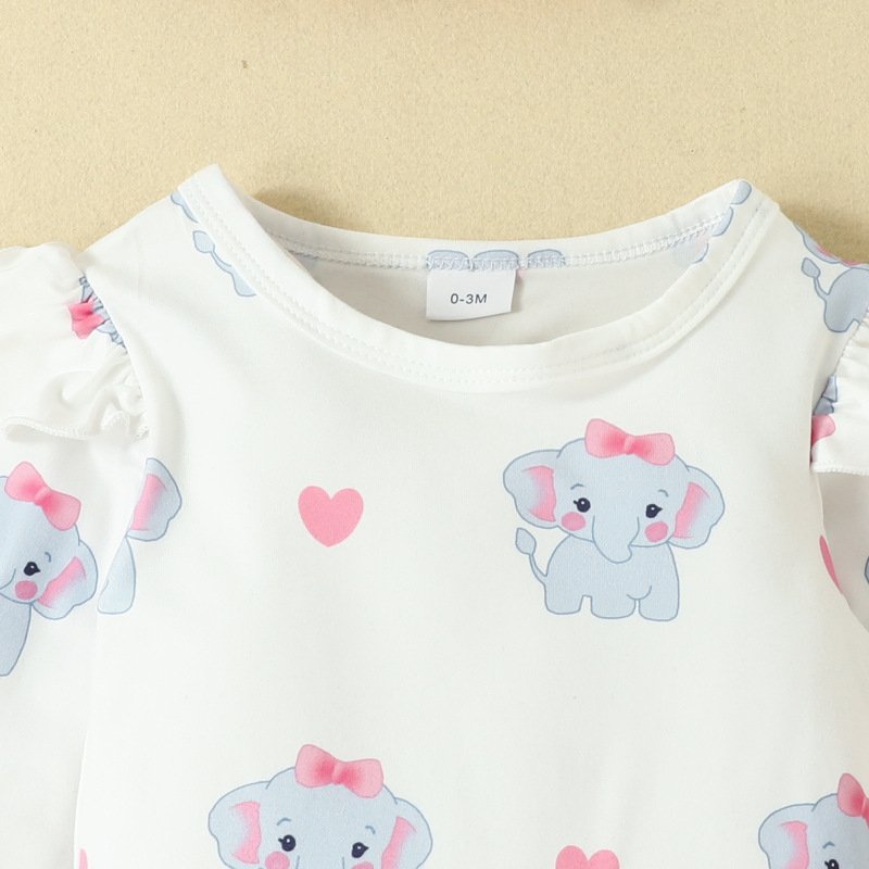 Toddlers Newborn Baby Girls Elephant Print Long Sleeve Bodysuit And Animal Suspender Skirt 2pcs Set