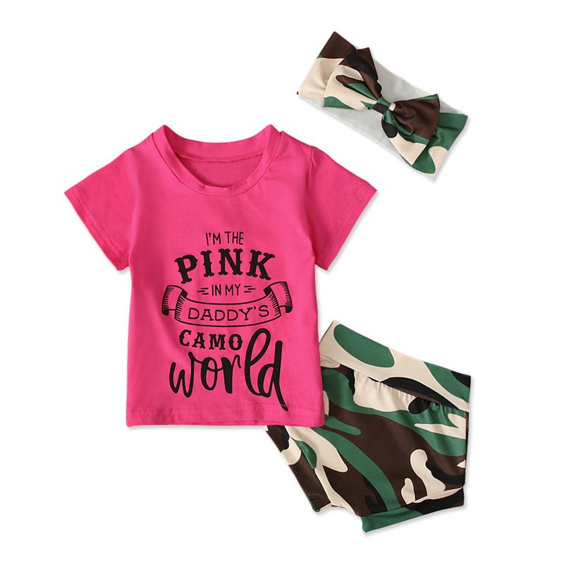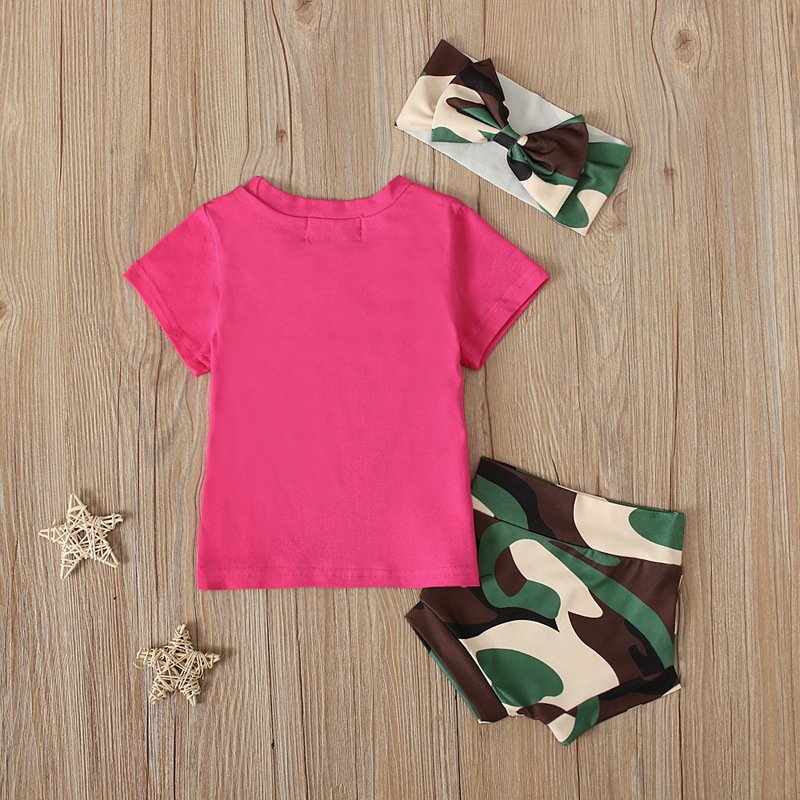 Toddlers Newborn Baby Girls Short Sleeve Print T-Shirt And Camouflage Shorts Headband 3pcs Set