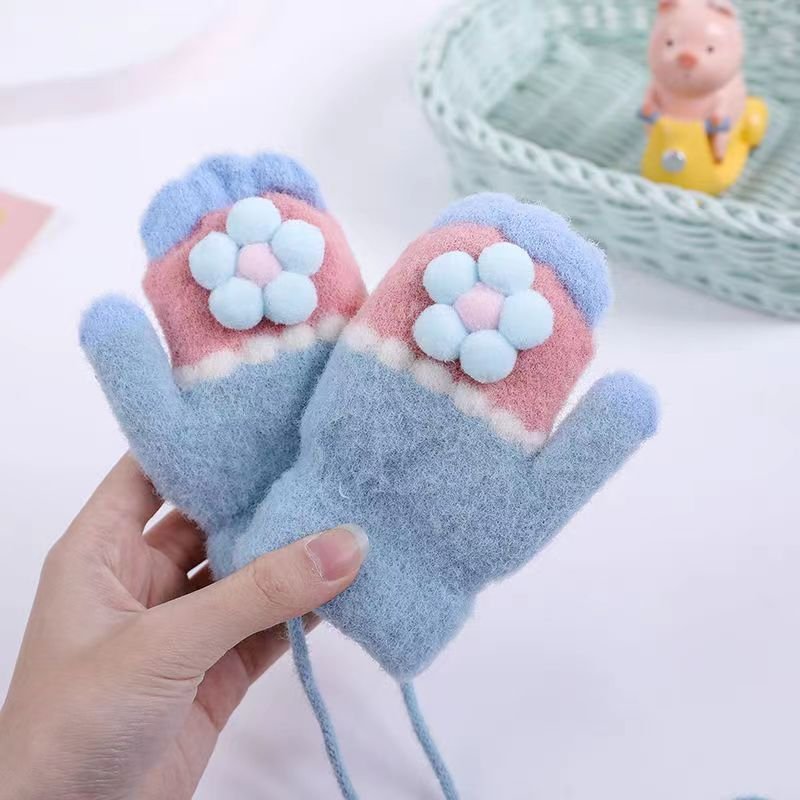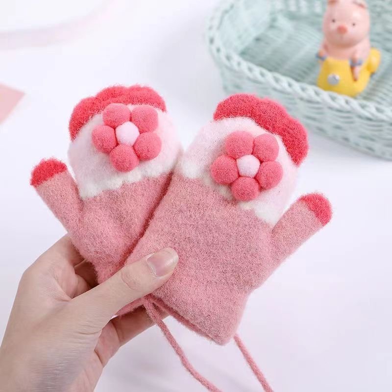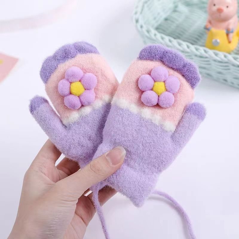 Winter Children Cartoon Color Block Stereo Floral Lanyard Warm Knitted Gloves